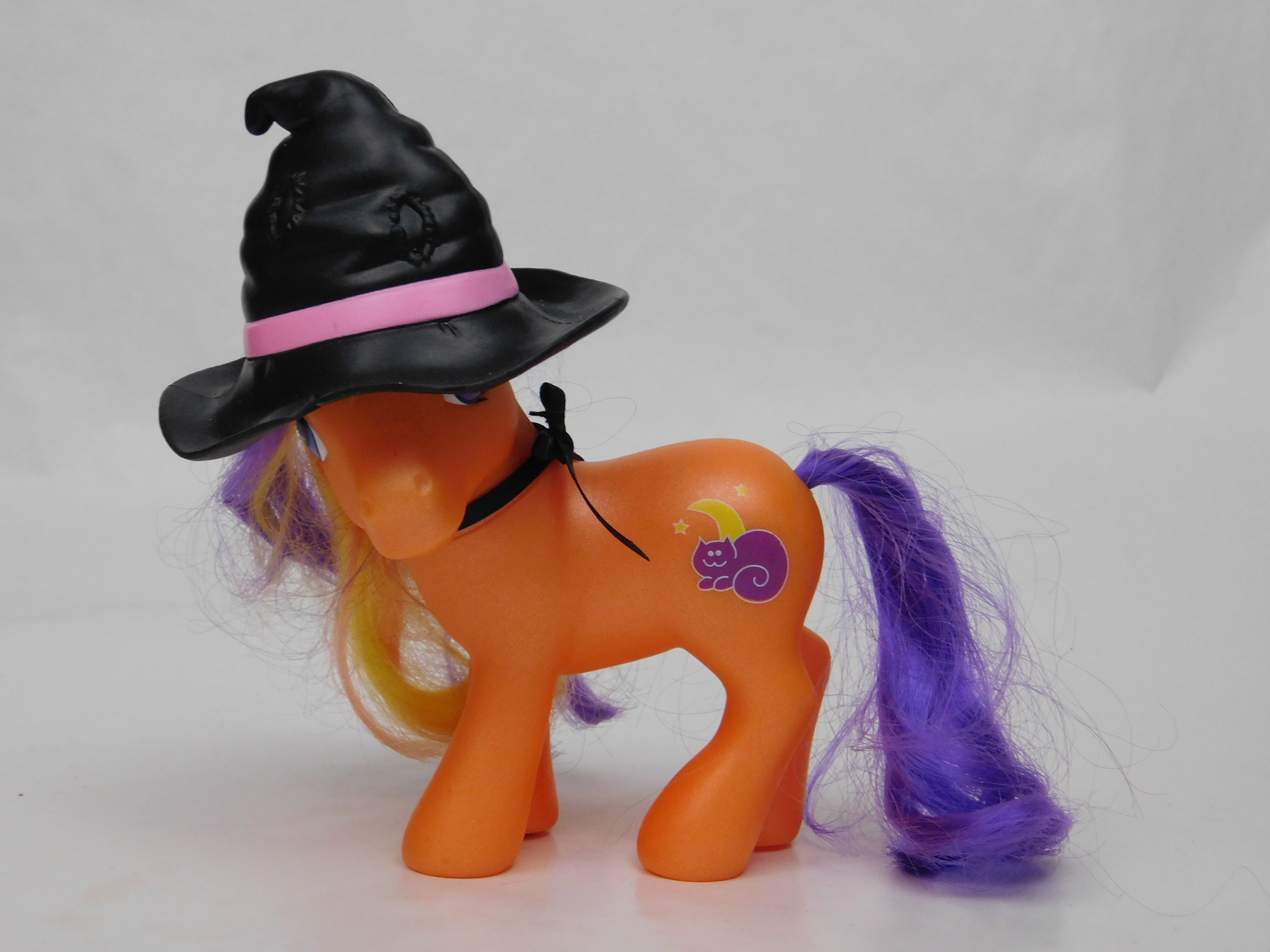 I love holiday exclusive ponies, and of them, my favourite is almost definitely Pumpkin Tart! She’s a bright orange and purple pony with a cutie patootie purple kitten and moon cutie mark, and a sweet little black bow tied ribbon on her neck and I just absolutely adore Pumpkin Tart.